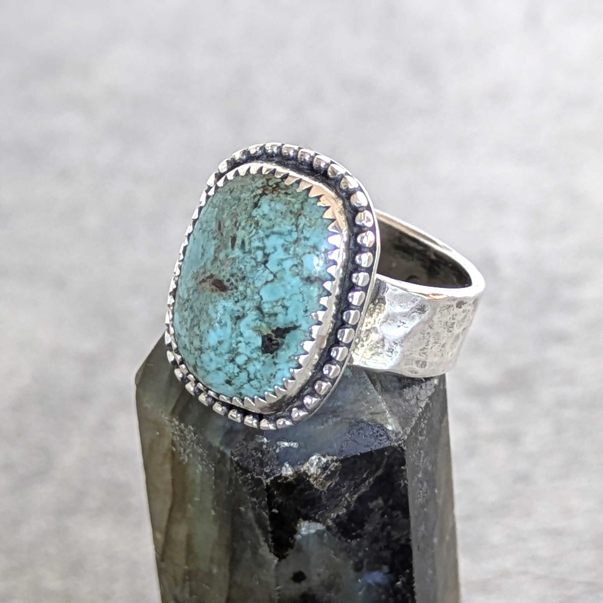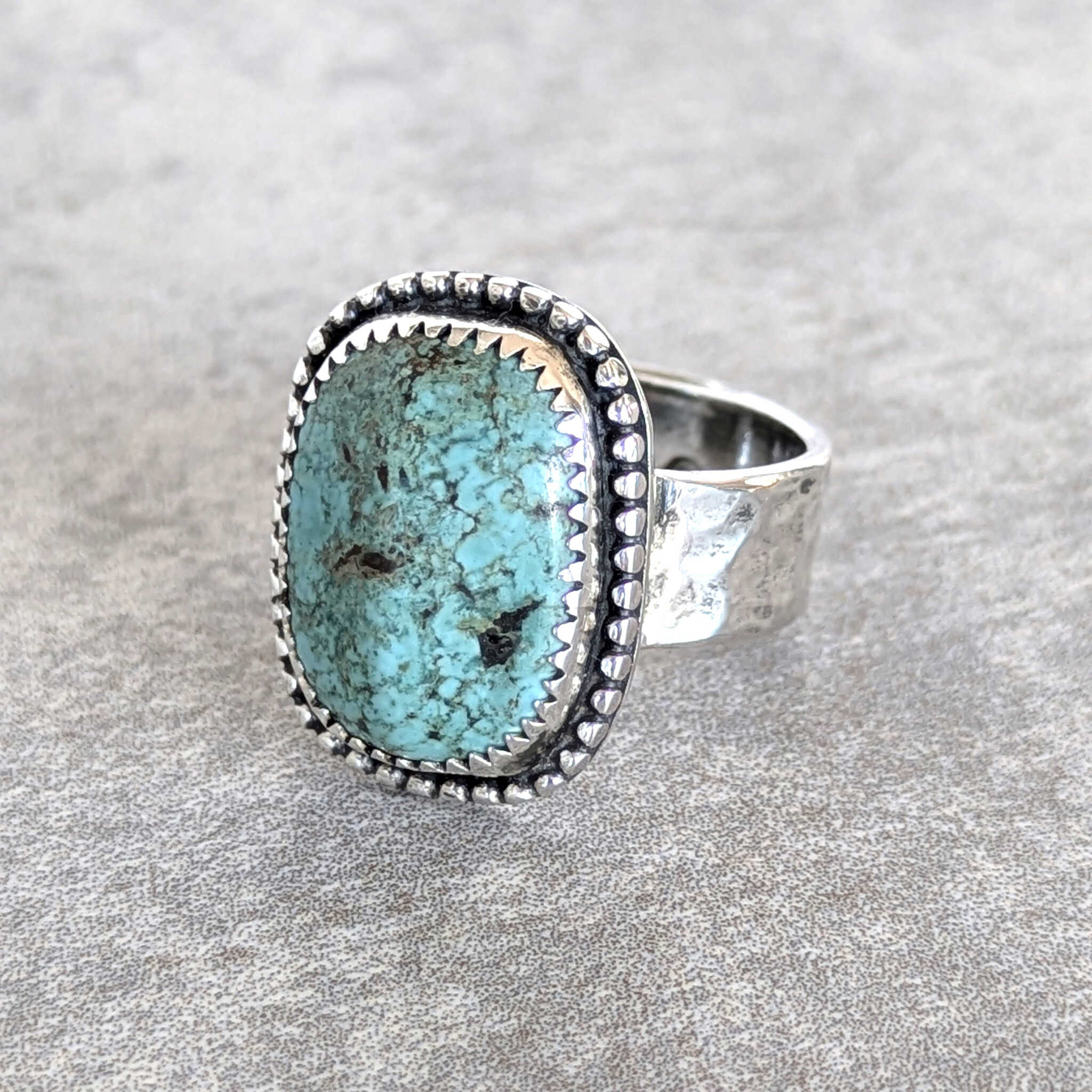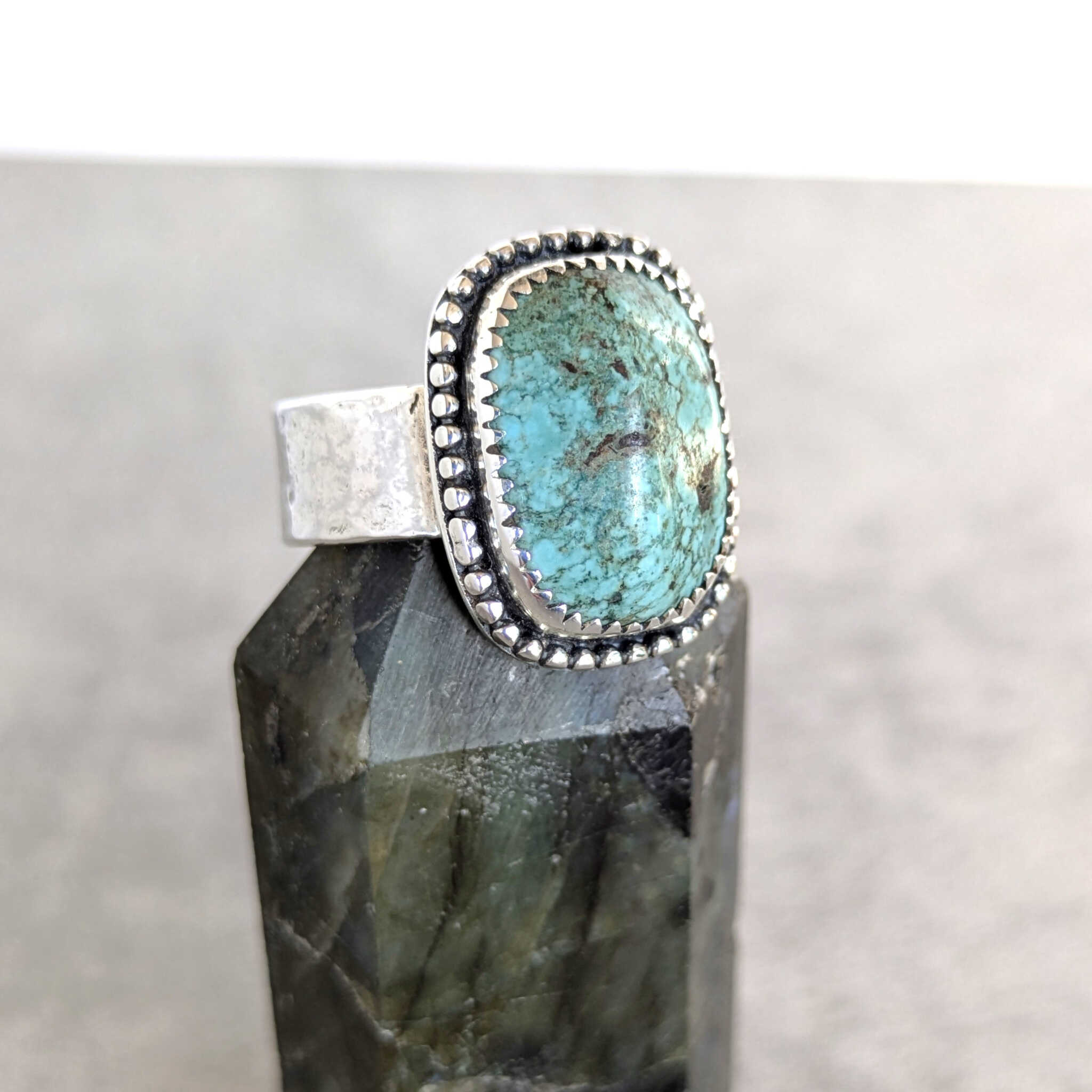 טבעת כסף ייחודית ומרשימה זו משלבת אבן טורקיז מרובעת בצורתה המיוחדת ולא סטנדרטית, נעשתה בעבודת יד מוקפדת מהתחלה עד הסוף.