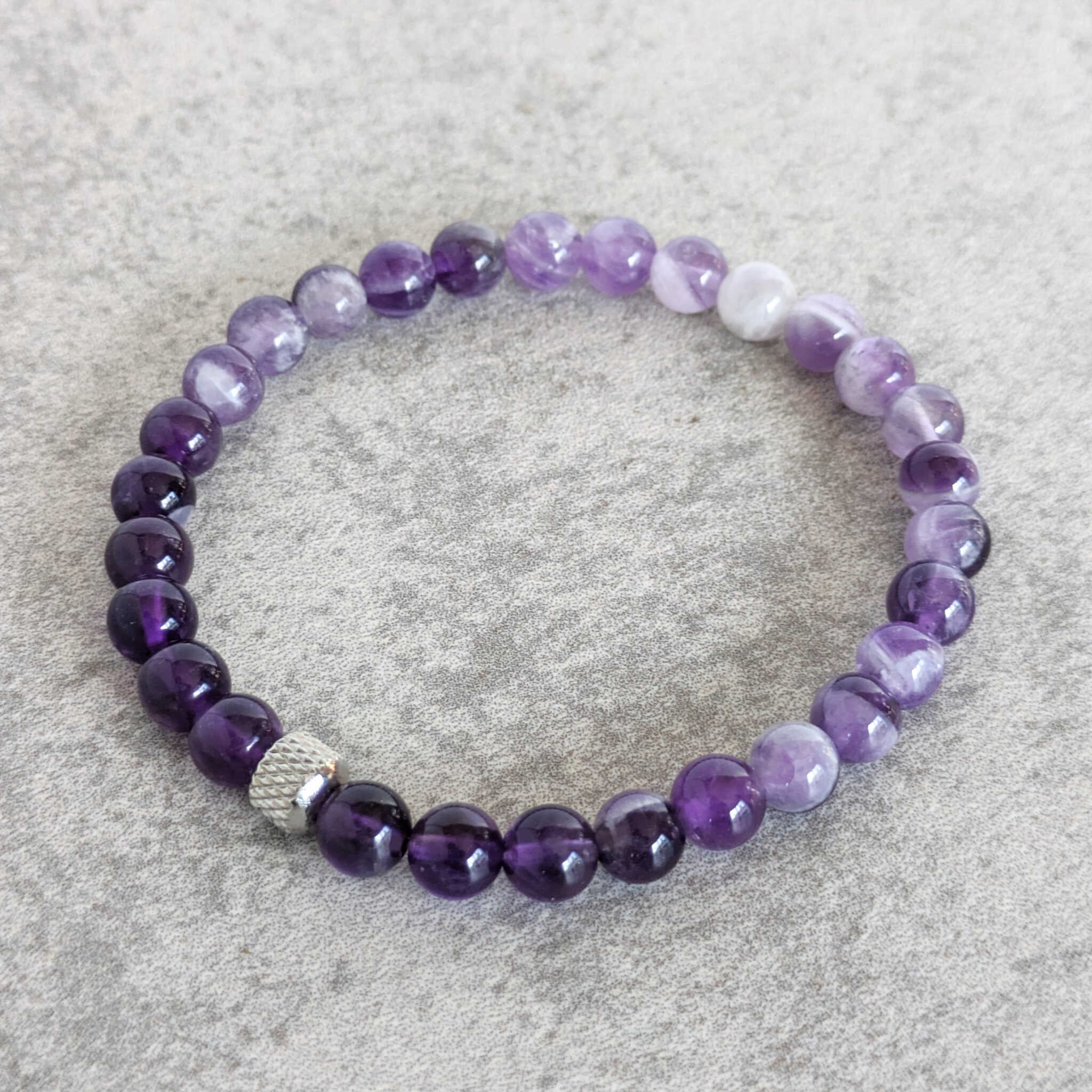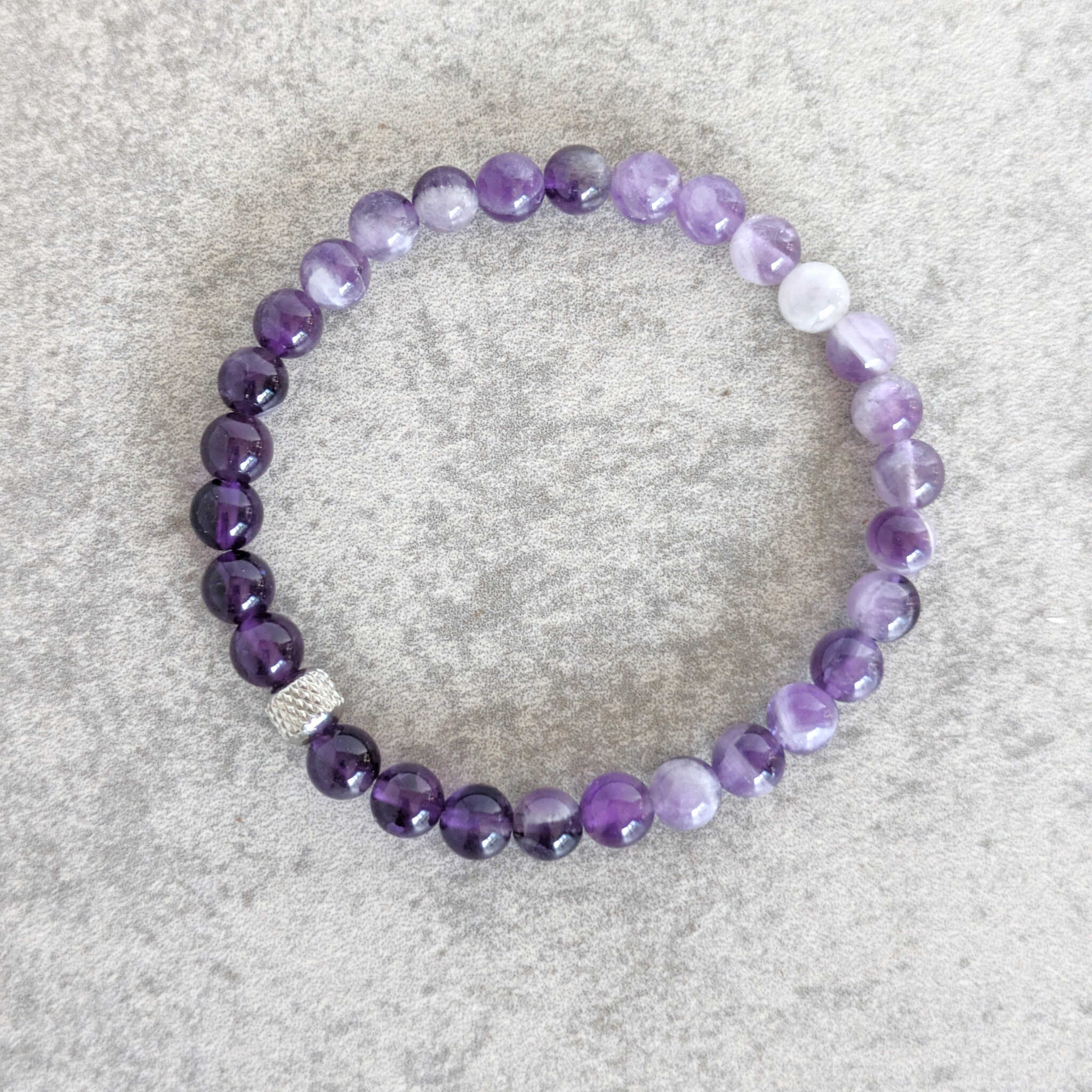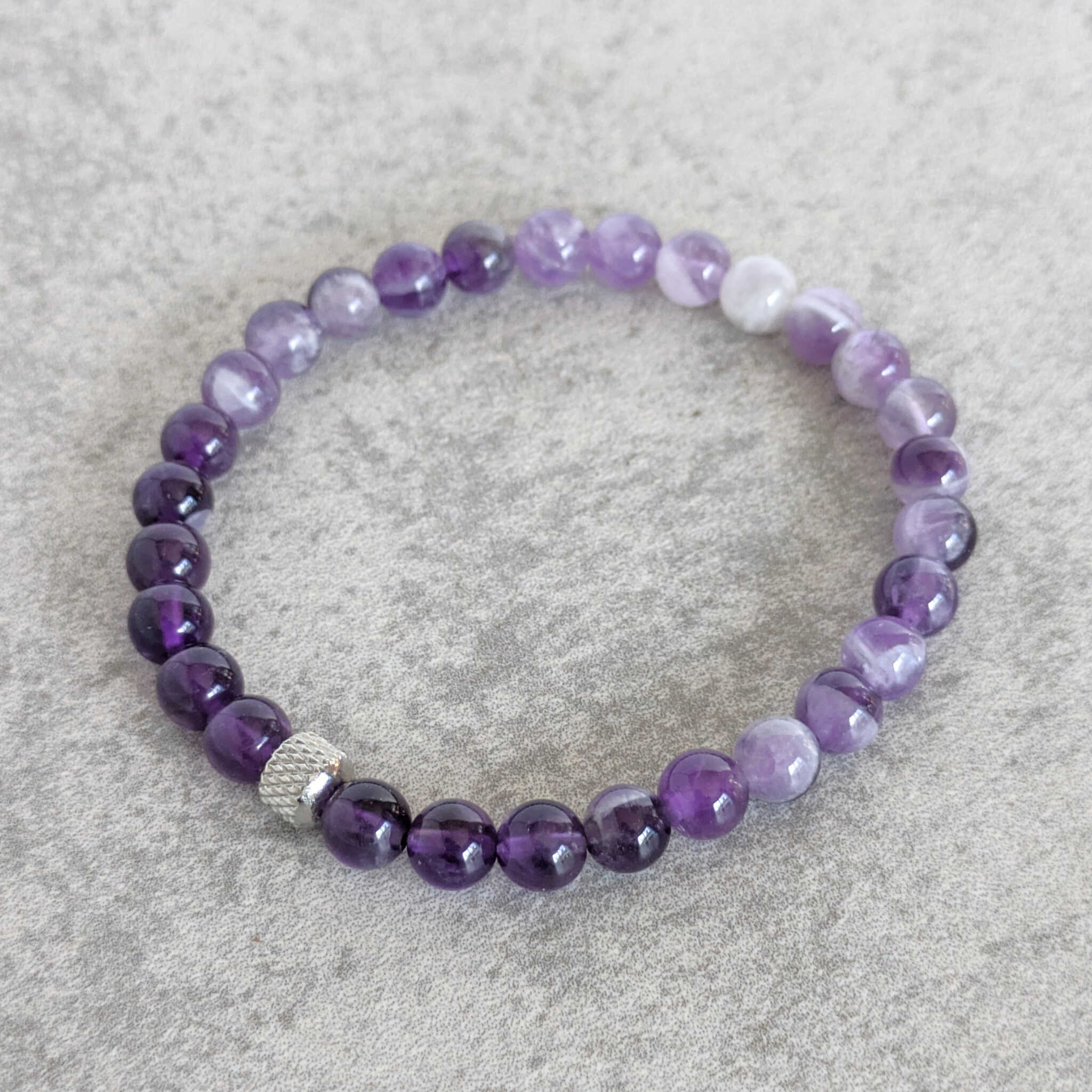 צמיד אבני אמטיסט סגולים שכל חרוז וחרוז נבחר בקפידה לפי הגוון הפנימי שלו, מהבהיר לכהה, עם חרוז סטיינלס סטיל להשלמת המראה.