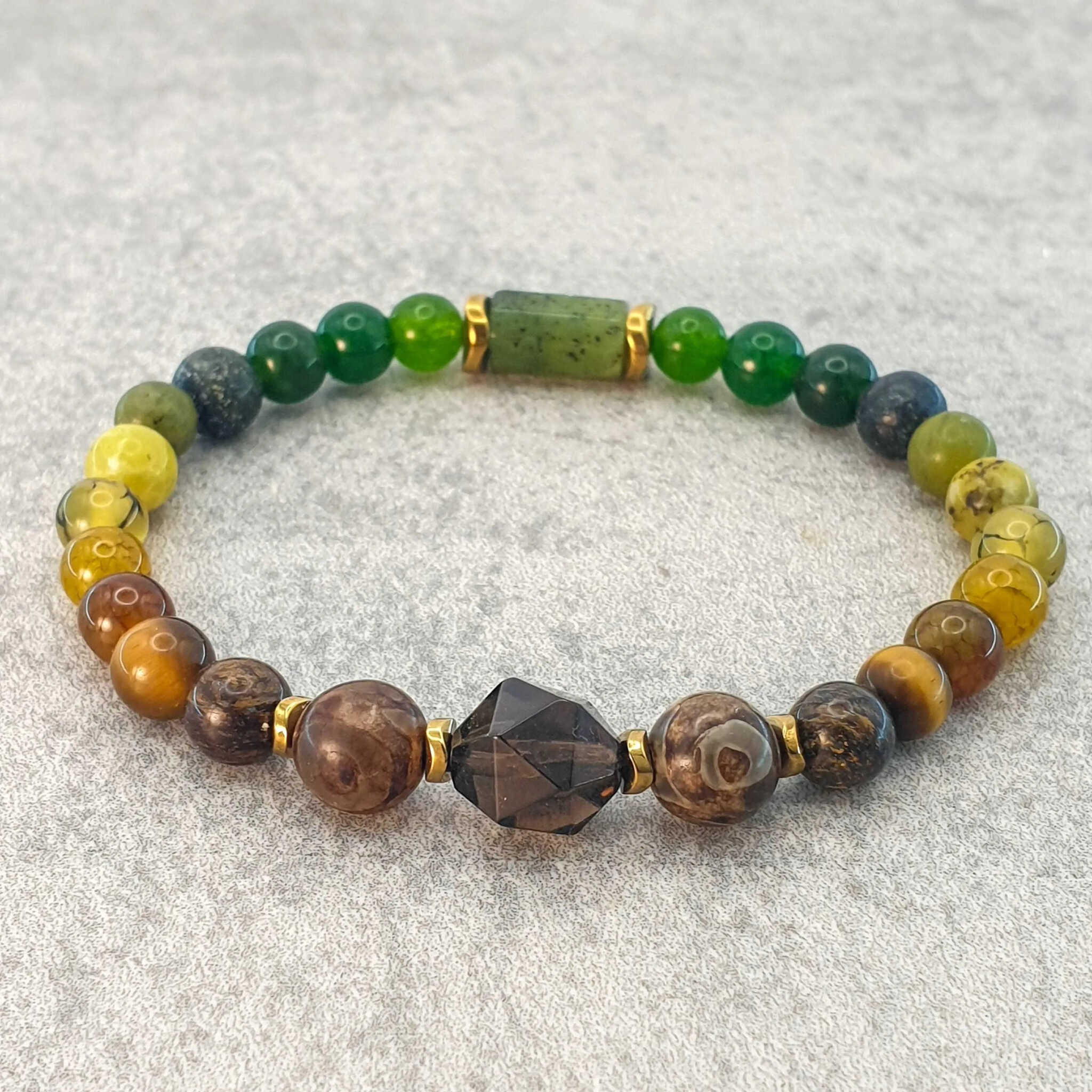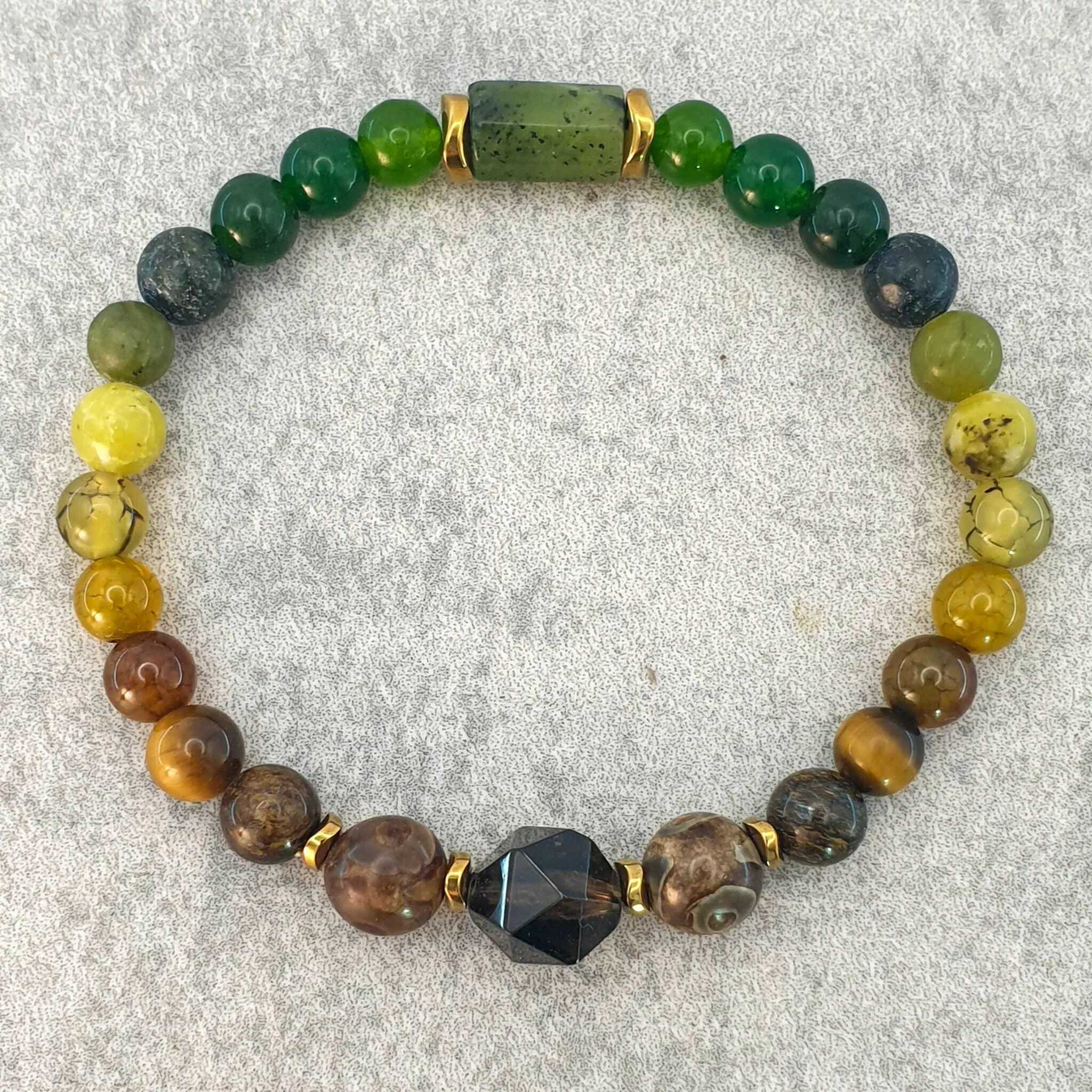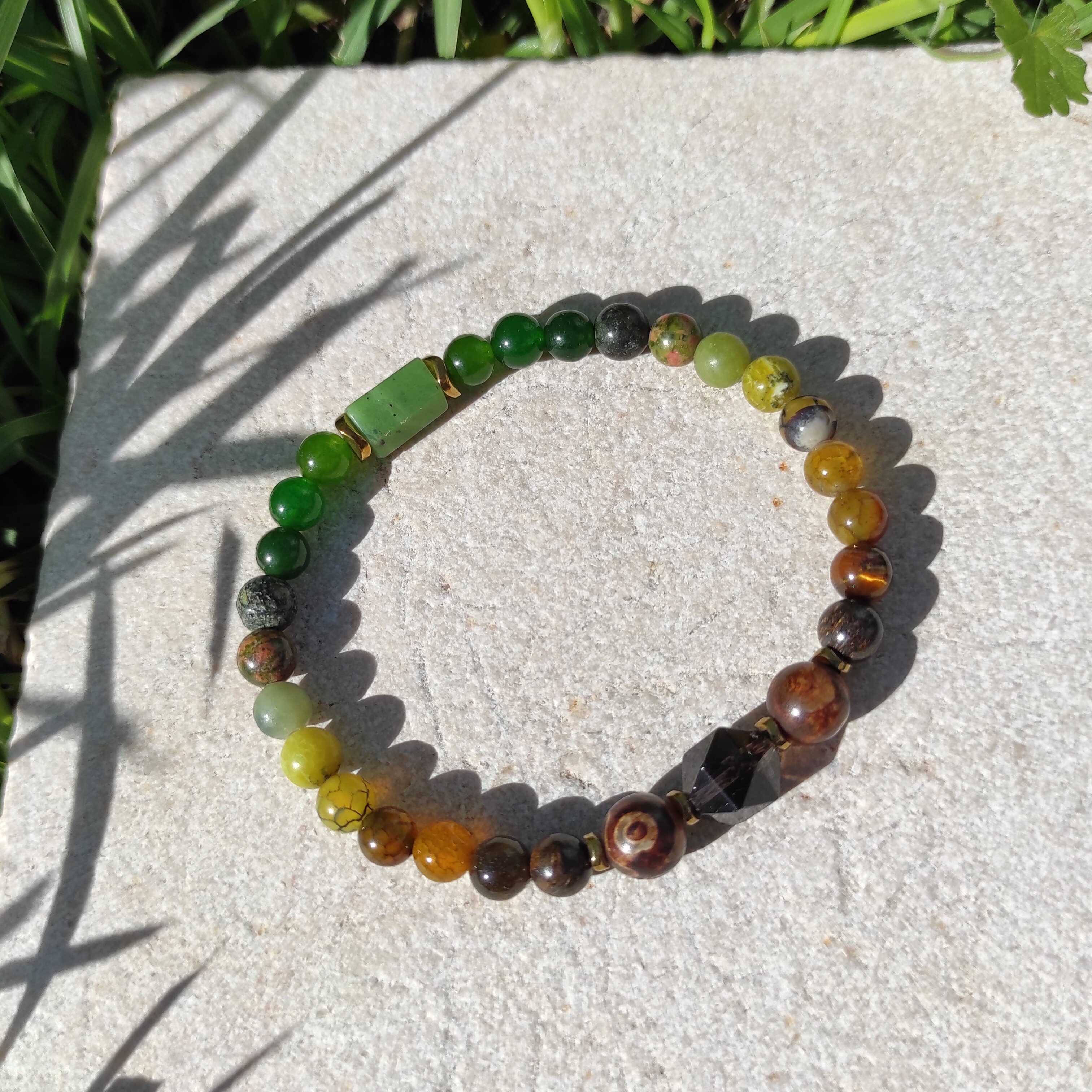 צמיד אבני חן טבעיות בצבעים של יער, טבע ואדמה, מזמין אותך להתחבר לרעיון של התחדשות, צמיחה וקבלת שינויים.