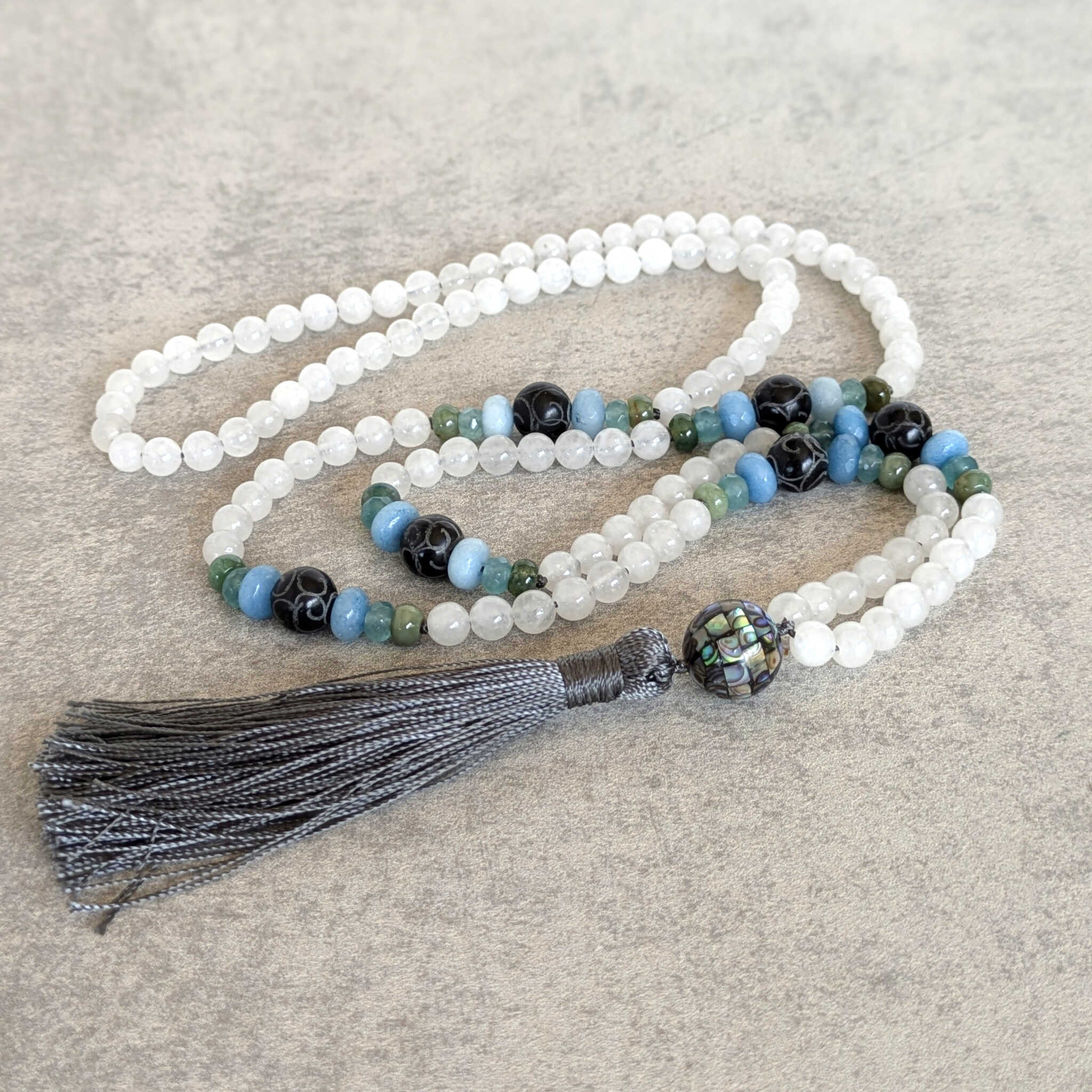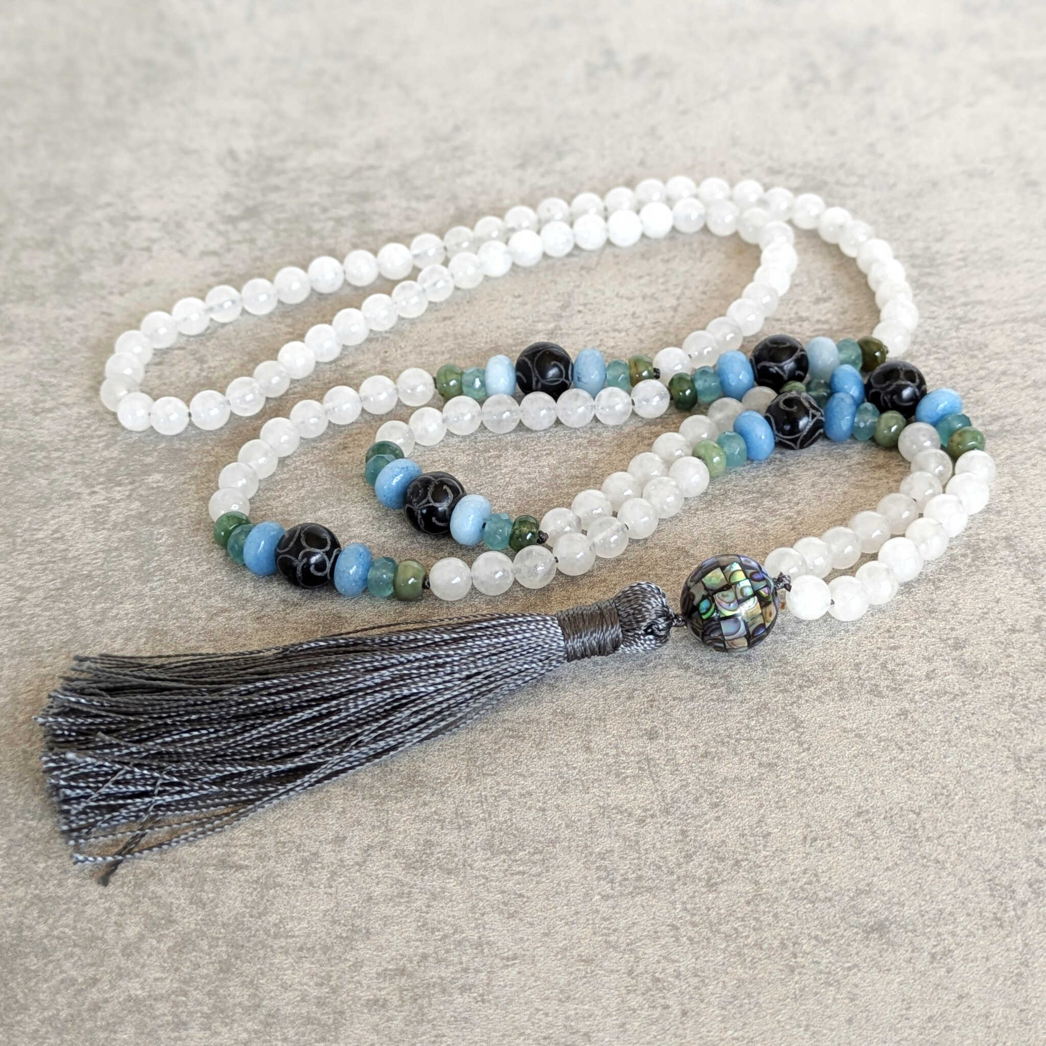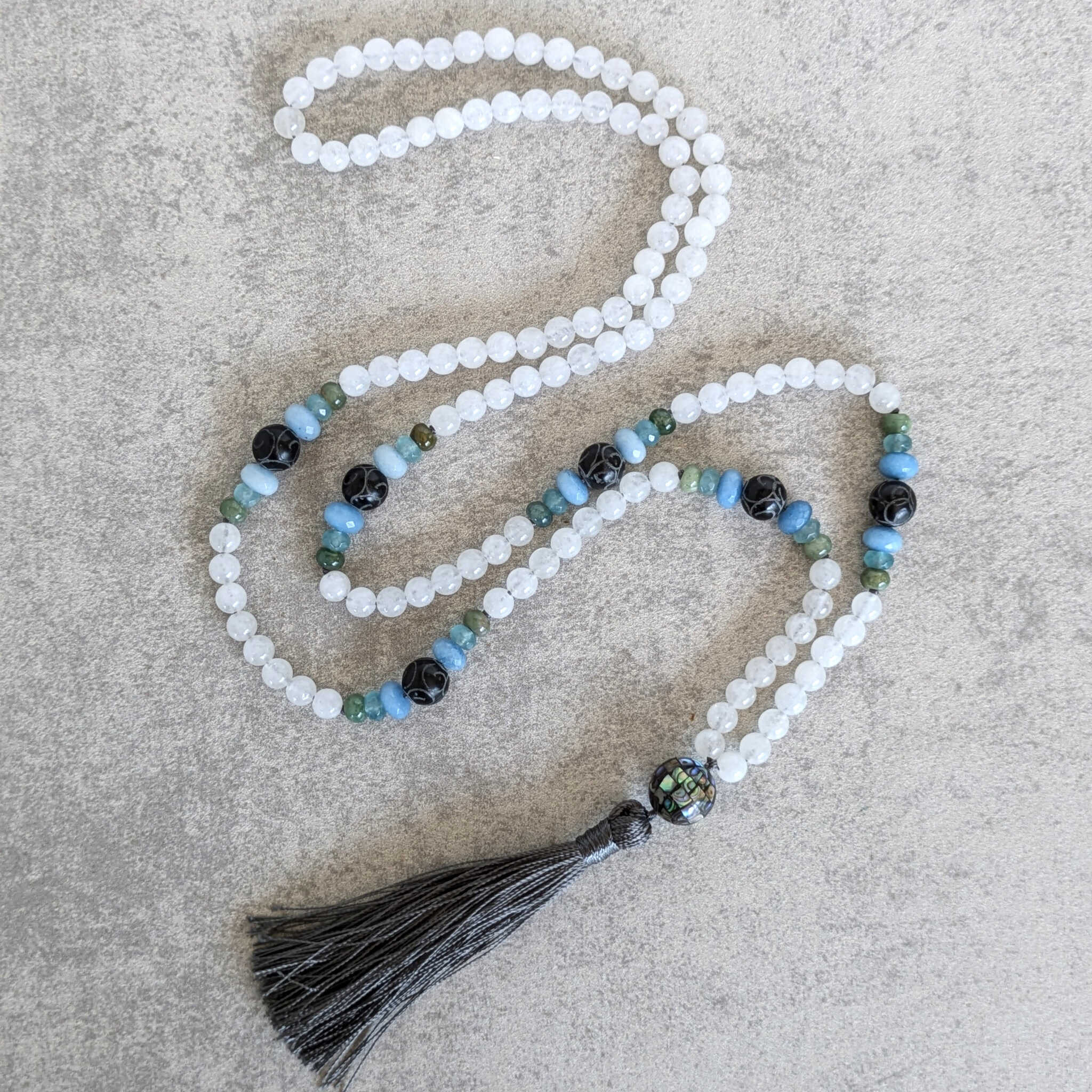 שרשרת מאלה עשויה מ-108 חרוזי קוורץ חלבי שנבחרו בקפידה, מציעה כלי עוצמתי למדיטציה וגילוי עצמי.