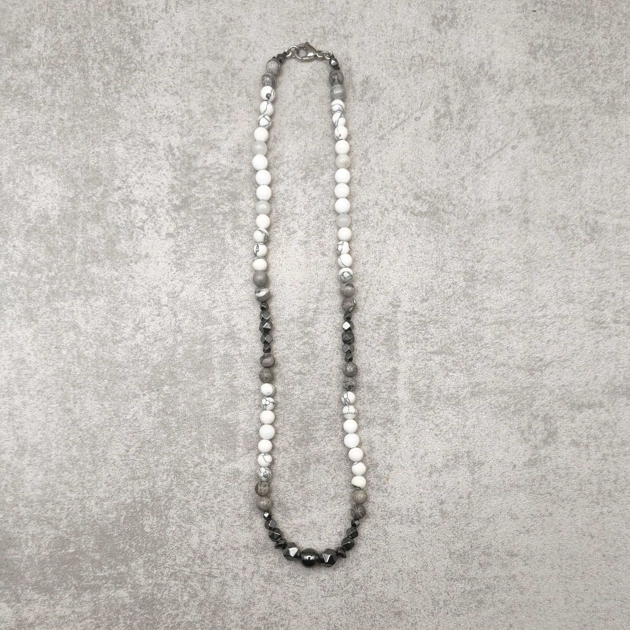 White Howlite, gray jasper, and hematite gemstone choker.