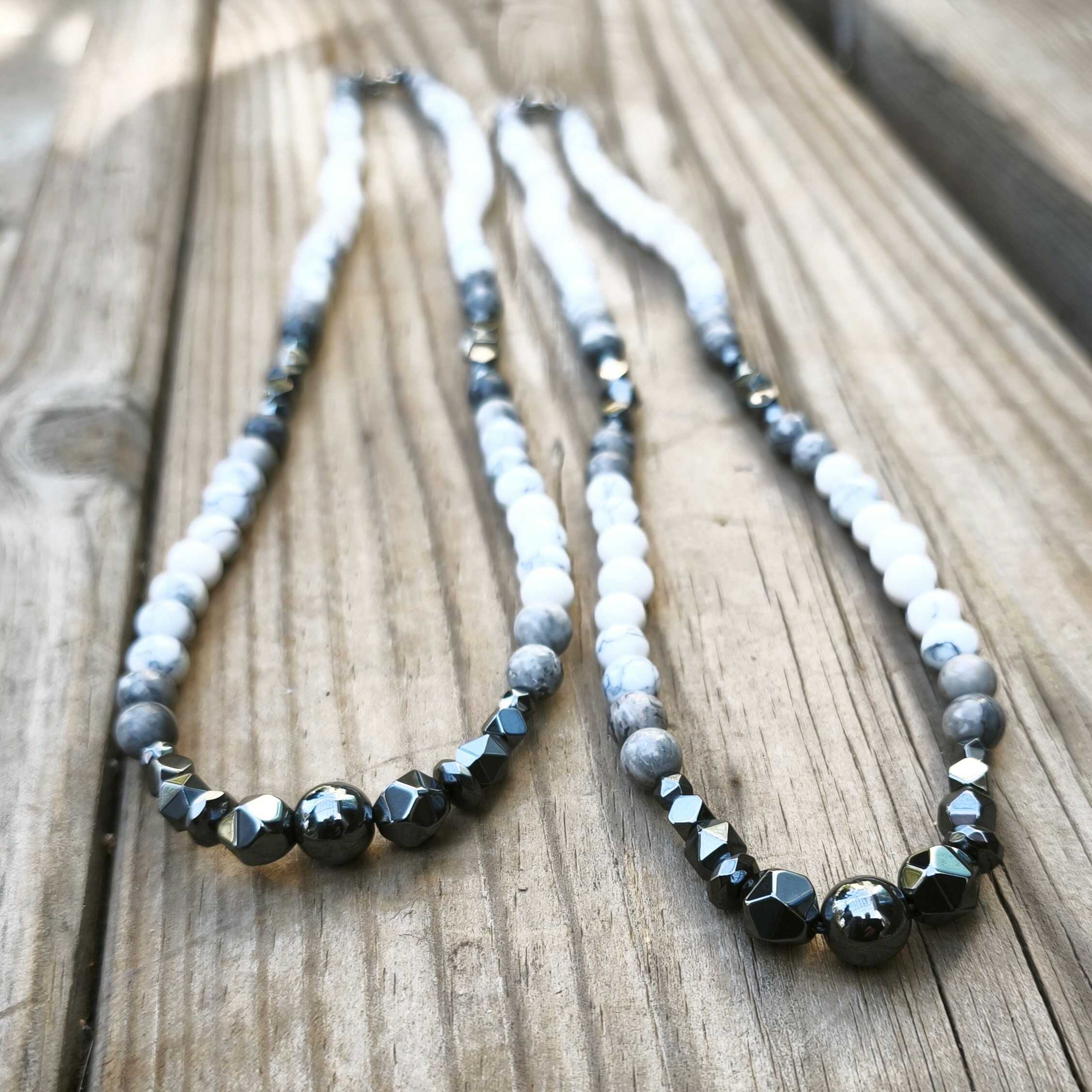 White Howlite symbolizes inner peace, patience and clarity of thought. It calms the thoughts, encourages calmness and helps to achieve peace of mind. Hematite provides powerful grounding, internal stability and energetic protection. It connects to the earth, strengthens inner strength and helps with concentration and balance.